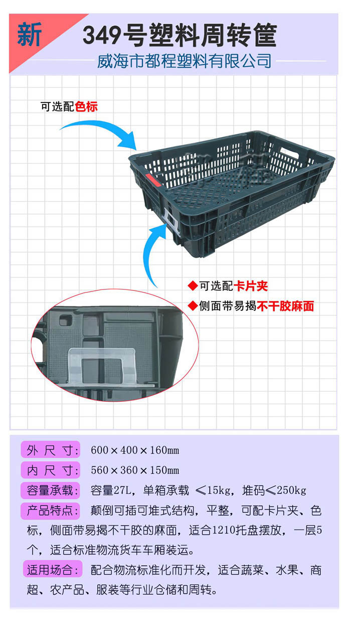 較早從事塑料托盤、塑料周轉箱生產,主導產品有塑料托盤、塑料周轉箱|筐、各種型號塑料筐、各種塑料盒|零件盒、ABS深水網浮等,產品品種有300多種,能夠滿足各行業貨物的倉儲和運輸的需要。